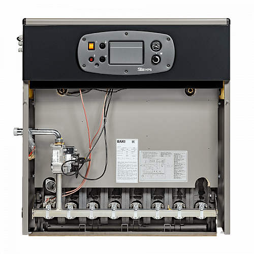 Газовый конвекционный напольный котел Baxi SLIM HPS 1.99 артикул A7114601 мощностью 99 кВт с открытой камерой сгорания. (Котел с открытой камерой забирает воздух для горения из комнаты и выводит отработанный газ через дымоход. Для устройства с закрытой камерой нужен коаксиальный дымоход. Он устроен по принципу «труба в трубе», когда по одной заходит воздух для поддержания пламени, по другой — выводятся продукты сгорания)
