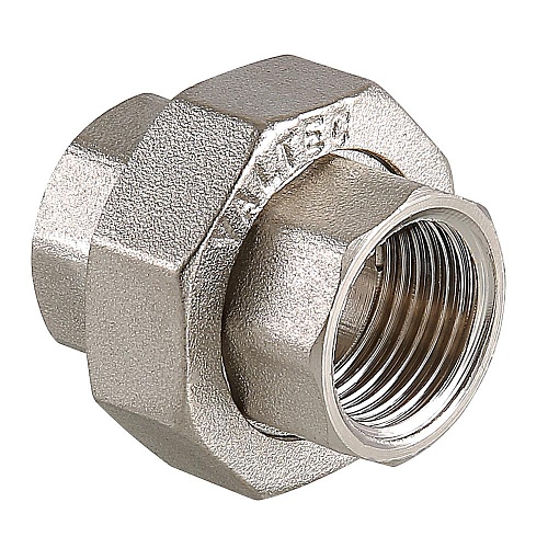 (VTr.340.N) Латунная никелированная разъемная муфта. Резьба – внутренняя/внутренняя, цилиндрическая трубная по ГОСТу 6357 (ISO 228, EN 10226), совместима также с наружной конической трубной резьбой по ГОСТу 6211 (ISO R7). Соединение частей муфты осуществляется с помощью накидной гайки. Уплотнительное кольцо выполнено из синтетического каучука EPDM. Гайку следует накручивать с приложением момента не более 30 H•м.
