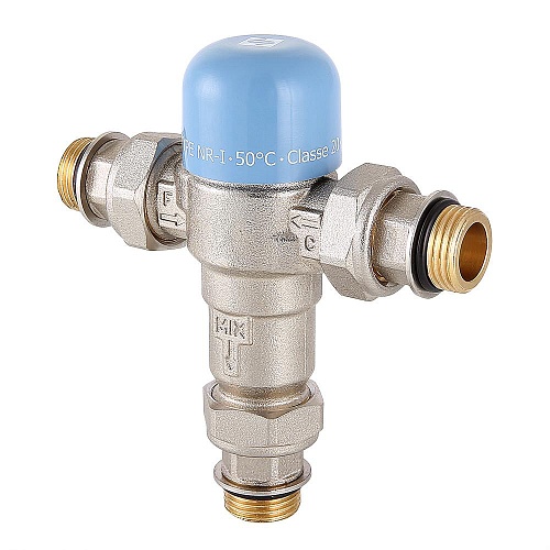 Трехходовой термостатический смесительный клапан с изменяемой в диапазоне от 30 до 50 °C настройкой. Предназначен для автоматического поддержания заданной температуры в системе горячего водоснабжения. Ее превышение исключается даже при полном отключении холодной воды, что позволяет использовать смеситель в школах, детских садах, других общественных зданиях. Термостат оперативно реагирует на изменение температуры и давления входящих потоков. Клапан выполнен из качественной латуни, никелирован. Встроенный термочувствительный элемент – жидкостного типа (наполнен толуолом). Патрубки клапана соединены накидными гайками с полусгонами. Резьба присоединений – внешняя. Входы смесителя комплектуются обратными клапанами из нейлона. Максимальная температура на входе горячей воды – 90 °C, допустимое рабочее давление входных потоков – до 10 бар.