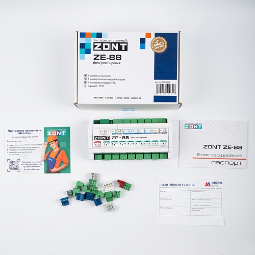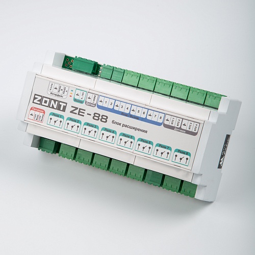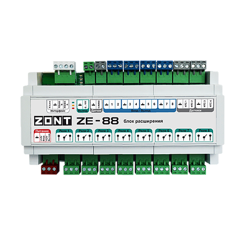 На объектах с многоконтурной системой отопления, где системой автоматизации могут быть охвачены несколько сооружений, для расширения аппаратных возможностей универсальных контроллеров ZONT H1000+ PRO, H1000+ PRO.V2, H1500+ PRO, H2000+ PRO, H2000+ PRO.V2 применяется блок расширения ZONT ZE-88.