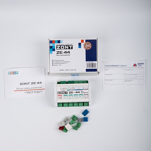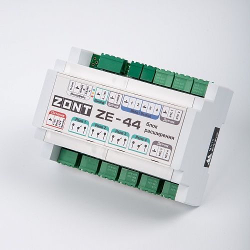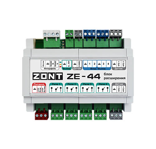 На объектах с многоконтурной системой отопления, где системой автоматизации могут быть охвачены несколько сооружений, для расширения аппаратных возможностей универсальных контроллеров ZONT H1000+ PRO, H1000+ PRO.V2, H1500+ PRO, H2000+ PRO, H2000+ PRO.V2 применяется блок расширения ZONT ZE-44.