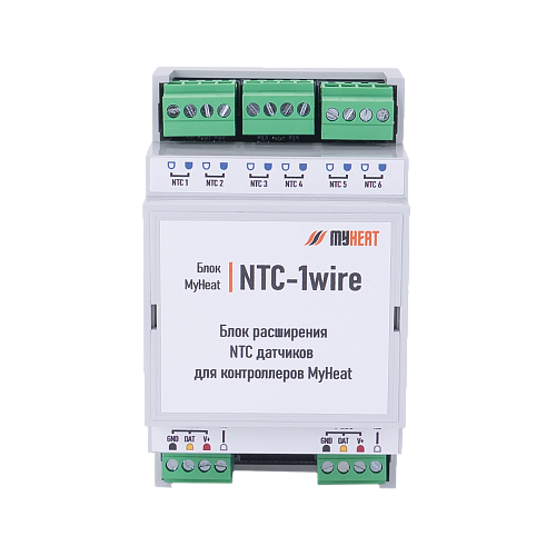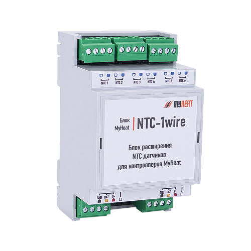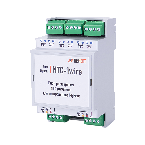 MyHeat NTC-1wire используется для подключения NTC-датчиков температуры к контроллерам и блокам расширения MyHeat в автоматизированных системах. Модуль имеет 6 входов для датчиков и интегрируется в шину 1-Wire, позволяя расширить возможности контроллера.
