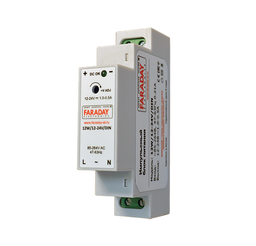 Блок питания FARADAY 12W/12-24V/DIN – источник электропитания стабилизированный импульсный, разработан для систем автоматики.