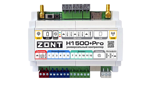 Универсальный контроллер ZONT H1500+ PRO обладает широким функционалом и подходит для контроля и управления сложными системами отопления. Прибор является современной версией контроллера ZONT H1000+ и соответствует профессиональным стандартам ZONT.