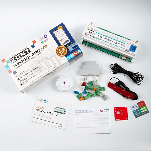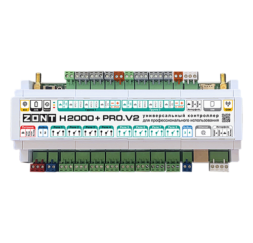 Универсальный контроллер ZONT H2000+ PRO.V2 — обновленная версия контроллера H2000+ PRO. Он обладает возможностями гибкого программирования для решения задач автоматизации и подходит для контроля и управления сложными системами отопления.