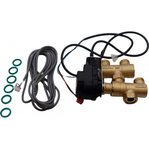 Комплект включает: трёхходовой клапан с электроприводом, датчик температуры ГВС для бойлера косвенного нагрева (10кОм), крепёж, уплотнение, инструкцию.
