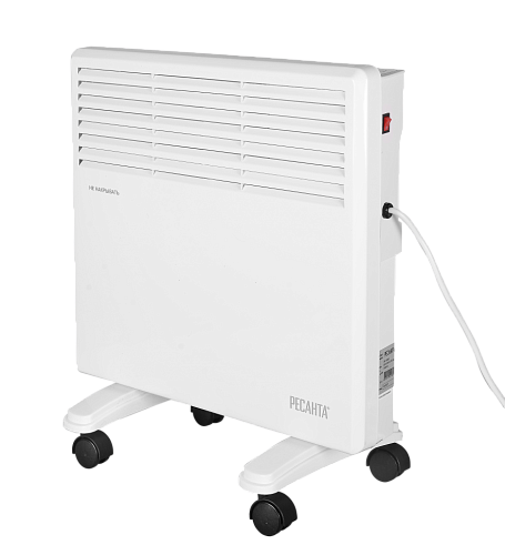 Электрический конвектор РЕСАНТА ОК-1000Е для обогрева помещений. Состоит из нагревательной части (ТЭН), заключенной в нижней части корпуса со щелеобразными отверстиями снизу и жалюзи в верхней части. Данная конструкция даёт возможность воздуху беспрепятственно проходить внутри конвектора,