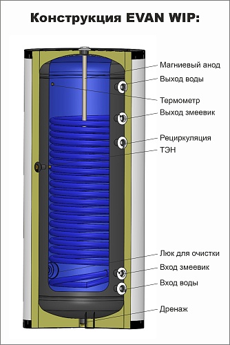 Эмалированный бойлер косвенного нагрева для тепловых насосов EVAN WIP предназначен для организации горячего водоснабжения с геотермальными и воздушными тепловыми насосами. Увеличенная площадь теплообмена змеевика дает низкое гидравлическое сопротивление и обеспечивает работу теплового насоса на заявленной заводом мощности, а также исключает возникновение ошибок и ограничений. Также бак имеет возможность встраивания дополнительного ТЭНа и ревизионный люк.