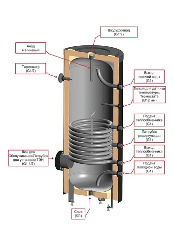 Бойлер косвенного нагрева с одним змеевиком может использоваться для организации энергоэффективного горячего водоснабжения. Совместим со всеми источниками тепла.