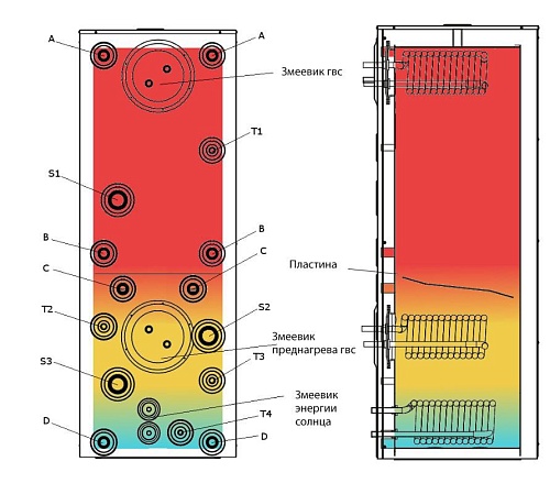 A: Зарядка гвс, вход в бак / Контур отопления, выход из бакаB: Зарядка гвс, выход из бака / Контур отопления, вход в бакC: Зарядка низкотемпературного нагрева, вход в бак / Низкотемпературный контур отопления, выход из бакаD: Зарядка низкотемпературного нагрева, выход из бака / Низкотемпературный контур отопления, вход в бак4. Вход змеевика,S1: Штуцер электротэна догрева гвсS2: Штуцер дополнительного тэна на отоплениеS3: Штуцер резервного тэна на отопление