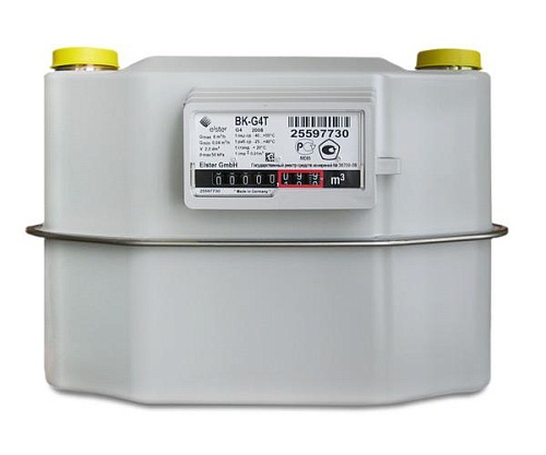 Измеряемая среда: природный газ, пропан, бутан, инертные газы и другие неагрессивные, неоднородные по химическому составу газы. Область применения: в коммунальном, бытовом хозяйстве и на предприятиях различных отраслей промышленности и в других сферах деятельности человека, требующих учета потребляемого газа. Принцип работы: счетчик состоит из измерительного механизма, корпуса и отсчетного устройства. Измерительный механизм состоит из набора камер со встроенными мембранами. Кривошипно-шатунный механизм преобразует поступательное движение мембран во вращательное, которое через муфту предаётся отсчетному устройству. Счетчик газа ВК G4Т(с механической термокоррекцией) построен по классической, хорошо зарекомендовавшей себя, надежной схеме. Отличительной особенностью счетчика является наличие в конструкции специального золотникового распределителя шиберного типа. Небольшие по размерам золотники, тонкие перегородки распределителя газа позволяют получить высокую точность измерения и обеспечивают низкую чувствительность счетчика к загрязнениям измеряемой среды. В счетчике установлены подвижные диафрагмы, изготовленные из высококачественного синтетического материала, позволяющего сохранять диафрагмам форму и целостность. Счетчик оснащен устройством, препятствующем обратному ходу счетного механизма. В конструкции счетчика применены самые современные и высококачественные материалы и покрытия, позволяющие обеспечить весьма малую потерю давления, низкий уровень шума при работе, минимальный износ подвижных деталей, высокую коррозионную стойкость металлических деталей. Именно наличие оригинальная конструкция золотников и распределителя шиберного типа, высококачественные диафрагмы, сохраняющие свою форму в течение всего периода эксплуатации, детали и узлы счетчика, изготовленные с высокой степенью точности, позволяют обеспечить стабильную работу самого прибора, низкую потерю давления и его высокую чувствительность. Для удаленной передачи информации к счетчику может быть подсоединен низкочастотный датчик импульсов (геркон) типа IN-Z61, срабатывающий от магнитной вставки, встроенной в младший разряд счетного механизма.
